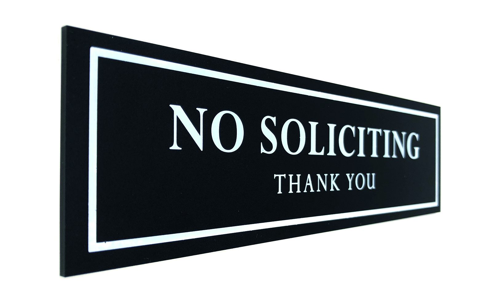 This sign looks great. I was searching for a sign that looked sharp and would blend well with my nice dark wood front door. This fit perfectly. It doesn’t take away from the warm look of my porch and undeniably gets the message to unwanted soliciting. The adhesive works great. Outstanding product so far—- it’s been in place for about 2 weeks now with drastic temperature changes.